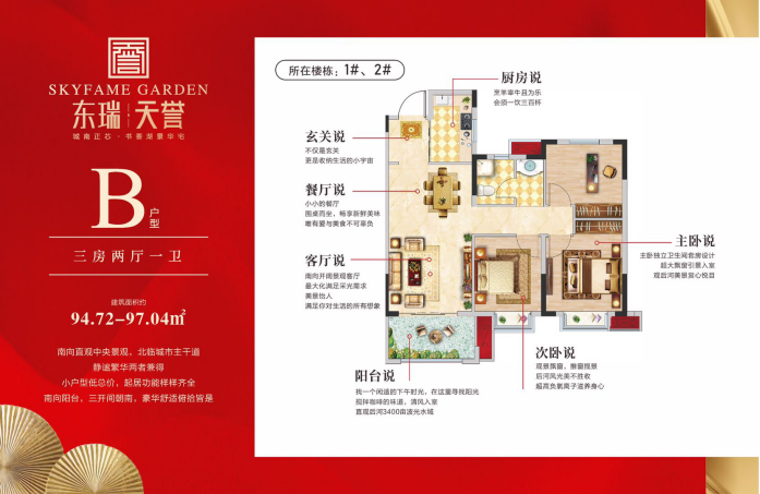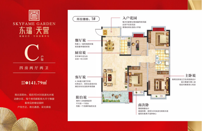 点阵式布局,南北错位排布,景观资源最大化,约94-142㎡3-4房纯板式湖景华宅,全飘窗设计,108㎡/142㎡户型入户花园打造,94-97㎡户型户户通透,115㎡户型独立电梯入户,塑造品质人居户型。